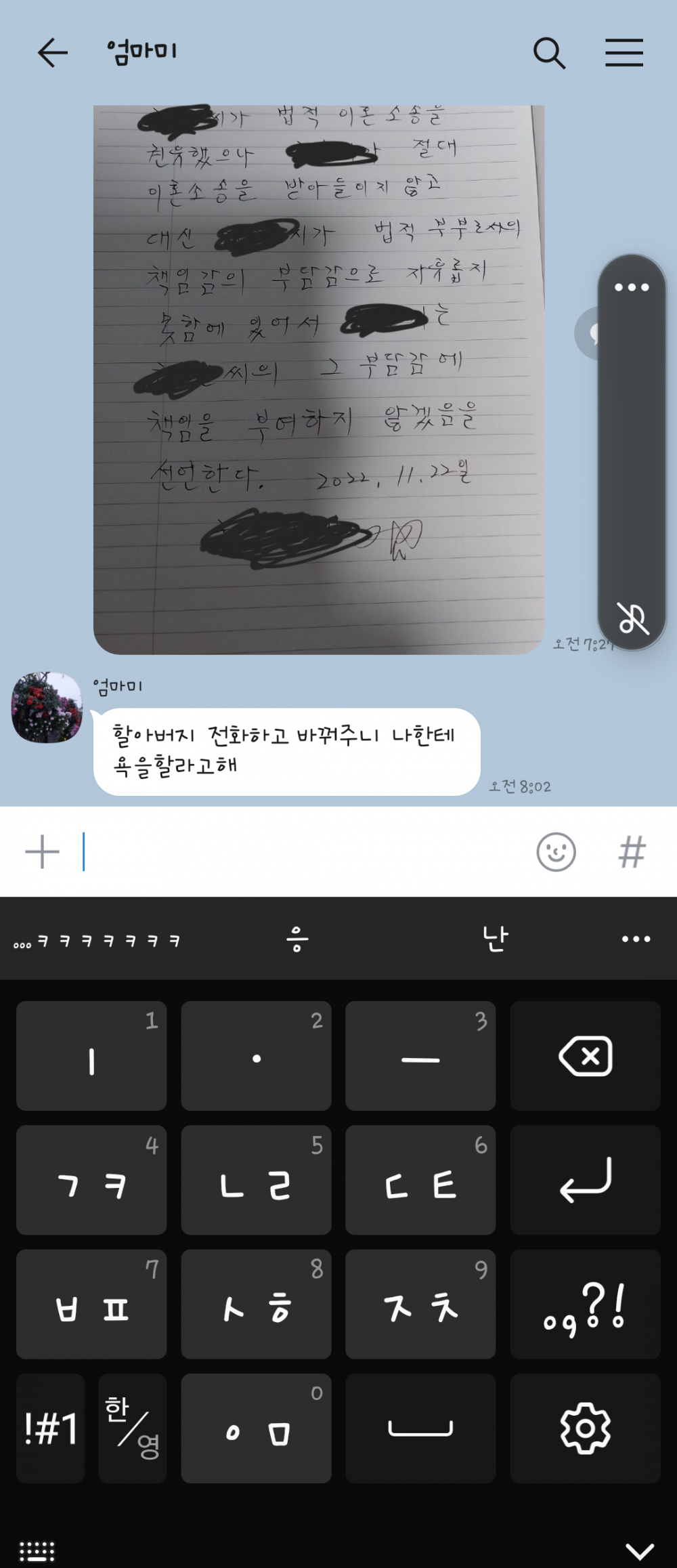 근데 엄마한테서 갑자기 저런 카톡이 옴 황당 그 자체다