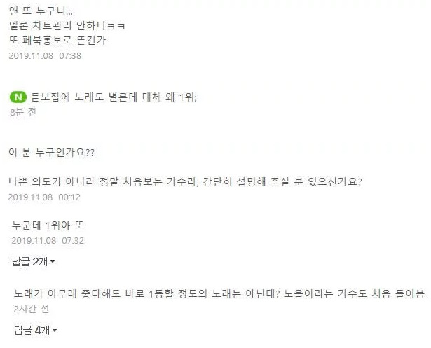 일부 멜론 이용자들은 "얜 또 누구니 멜론 차트 관리 안 하나? 또 페북 홍보로 뜬 건가", "듣보잡에 노래도 별로인데 왜 1위", "누구인가요?" 등 댓글을 남겼다.